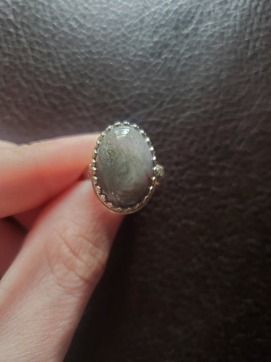 Moss Agate Ring, Size 7+ Sterling Silver Smithed Setting