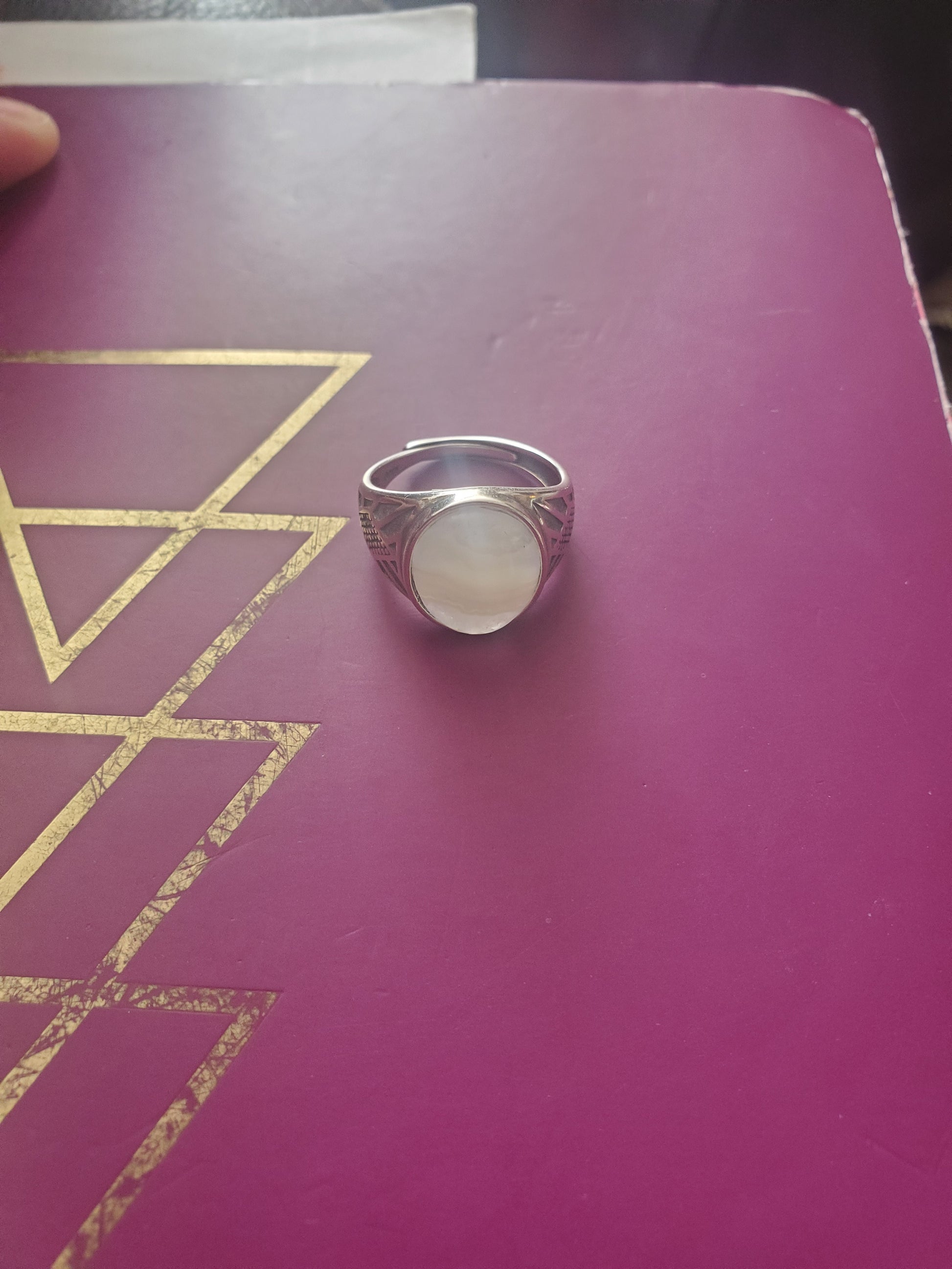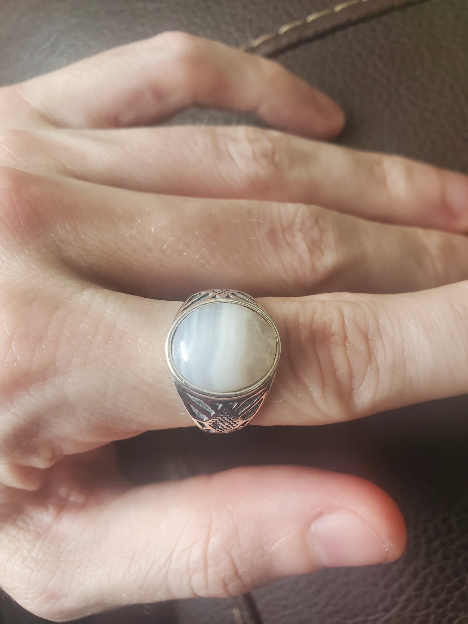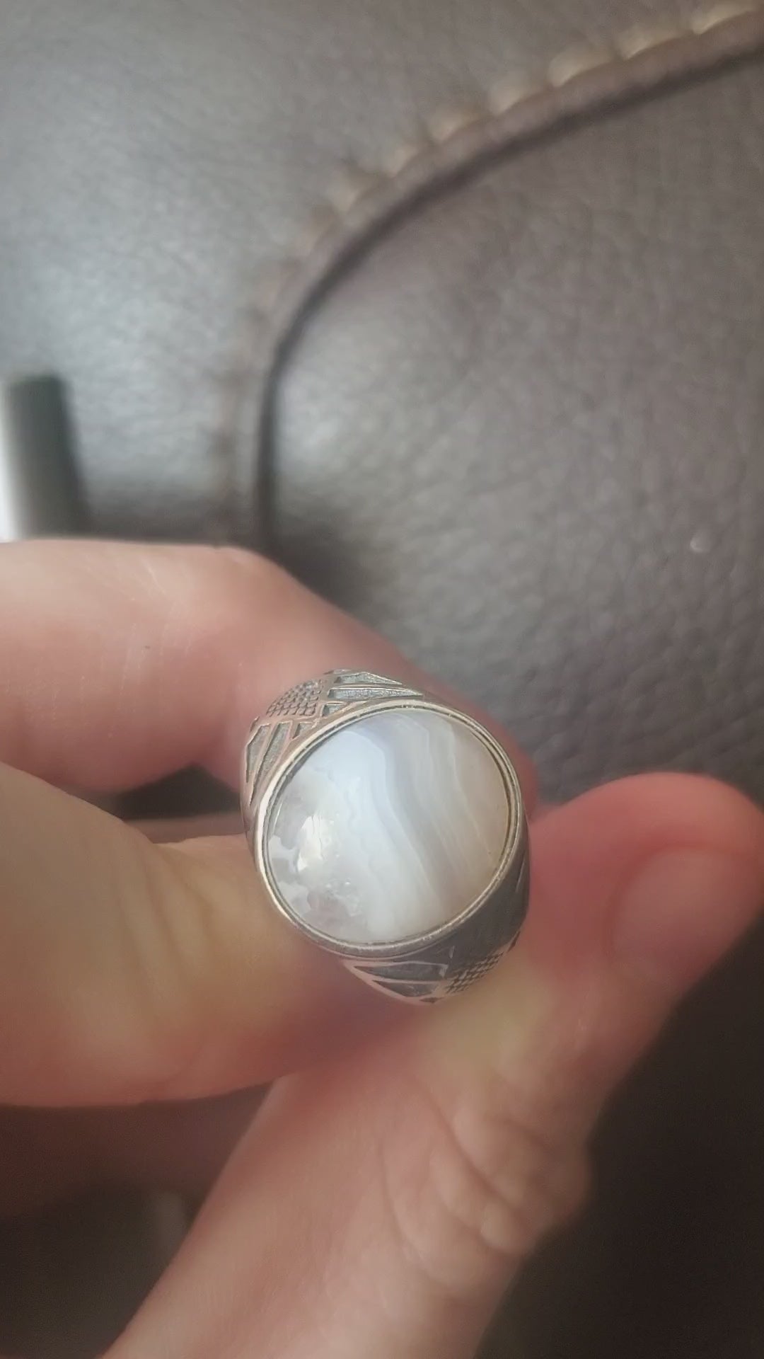 This piece features and banded agate with some quartz on top. You can see how the layers go from the more waterline agate, to the milky agate, to the crystalline quartz. Really good looking piece, and because it is adjustable it fits most. Unisex (for a man or women)