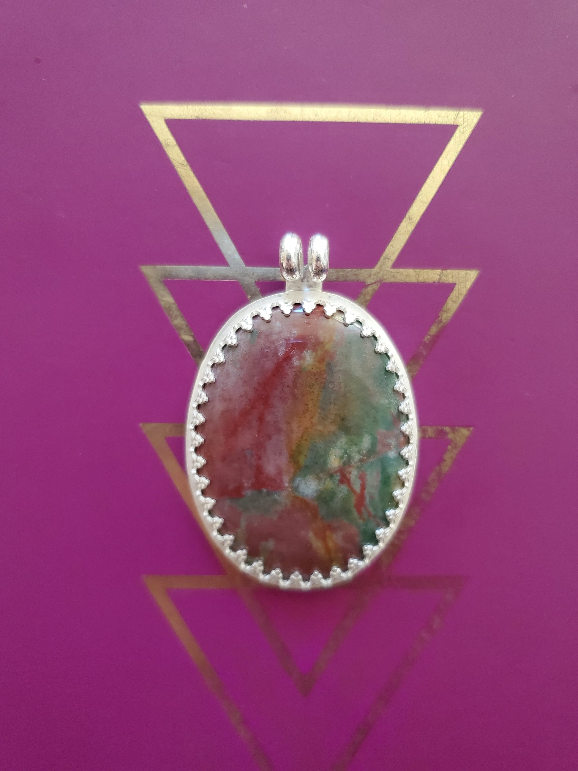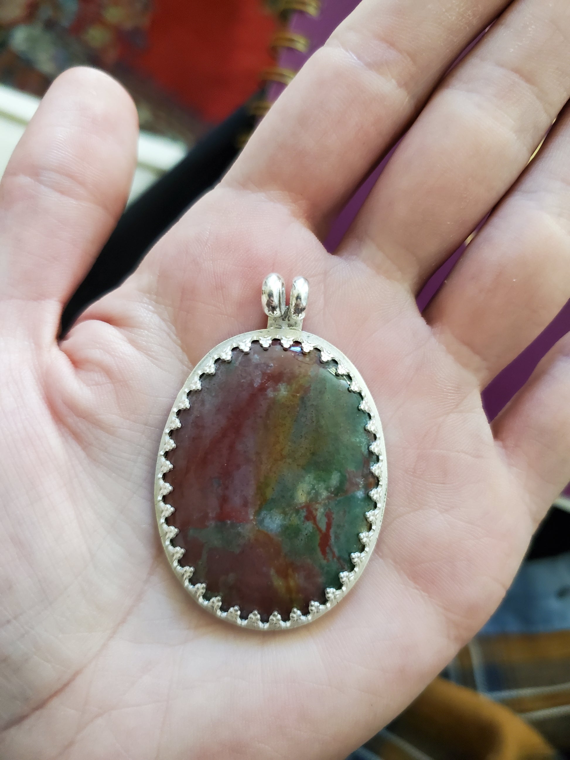 This is a piece that I made while I was learning silversmithing at the William Holland School of Lapidary Arts! It features a really pretty green and red bloodstone in a more elegant setting (which I made myself). A very special piece, indeed. I forget the size of this stone because it is free-formed, but it's decently sized, at least 30x22mm.