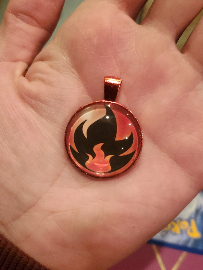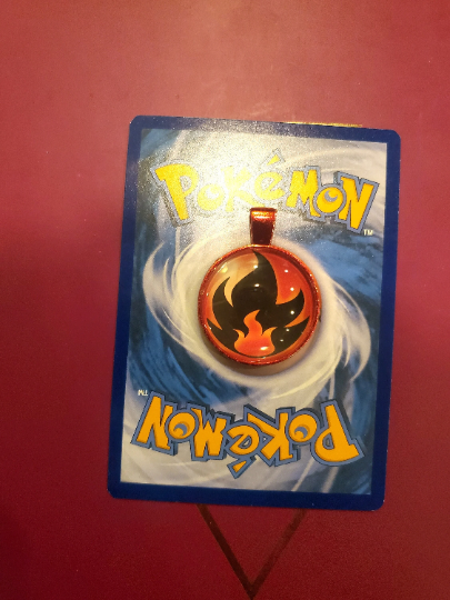 This keychain or pendant features a Fire Energy! The circular graphics really pop in the accessories. I really love the little extra details that some of these pendants have. Prices may vary by rarity of card used to make the pendant. If you wish to inquire about different color backing, or want more than one of a certain style, please message us and show you the style you like in the options we have.