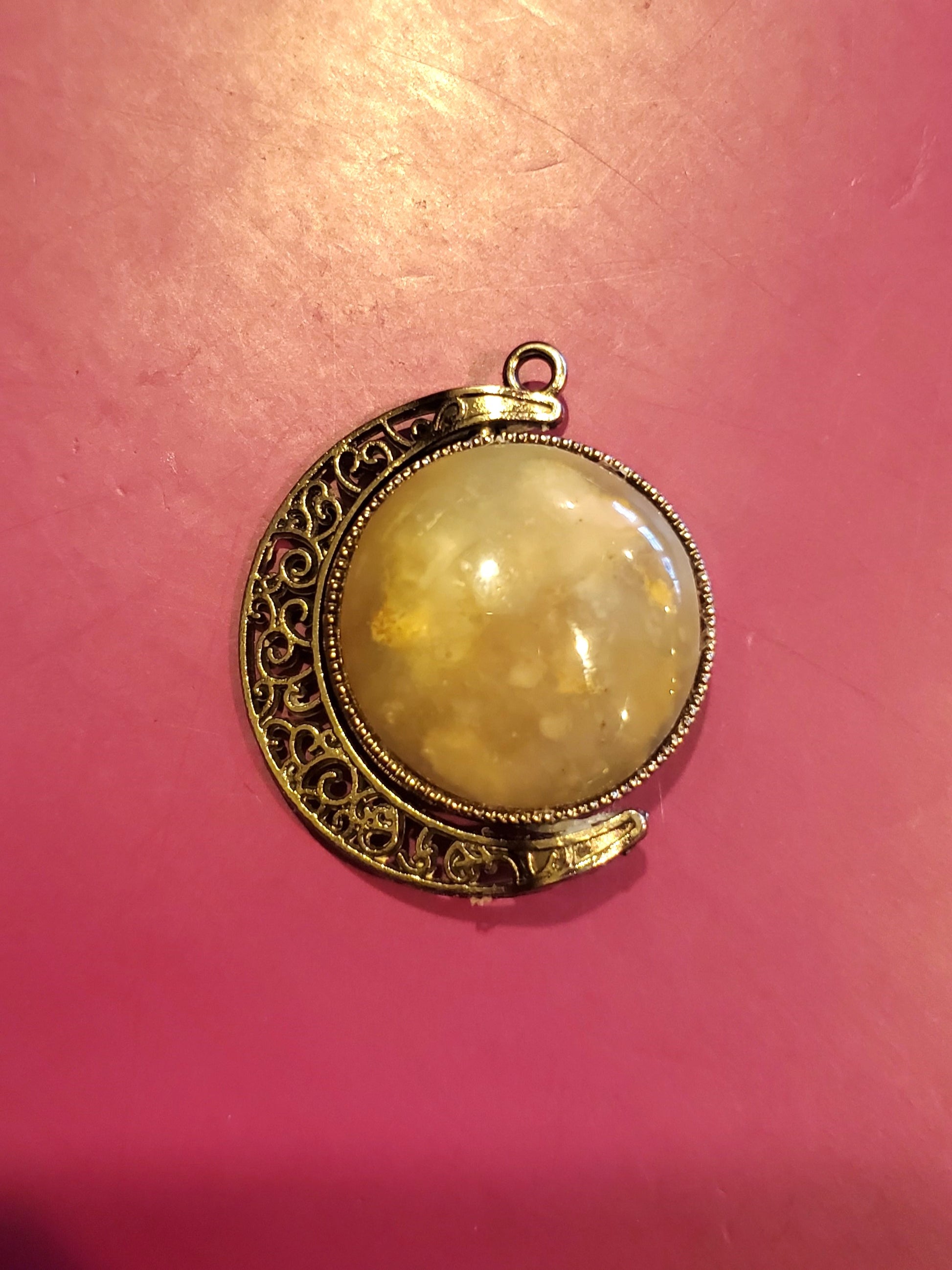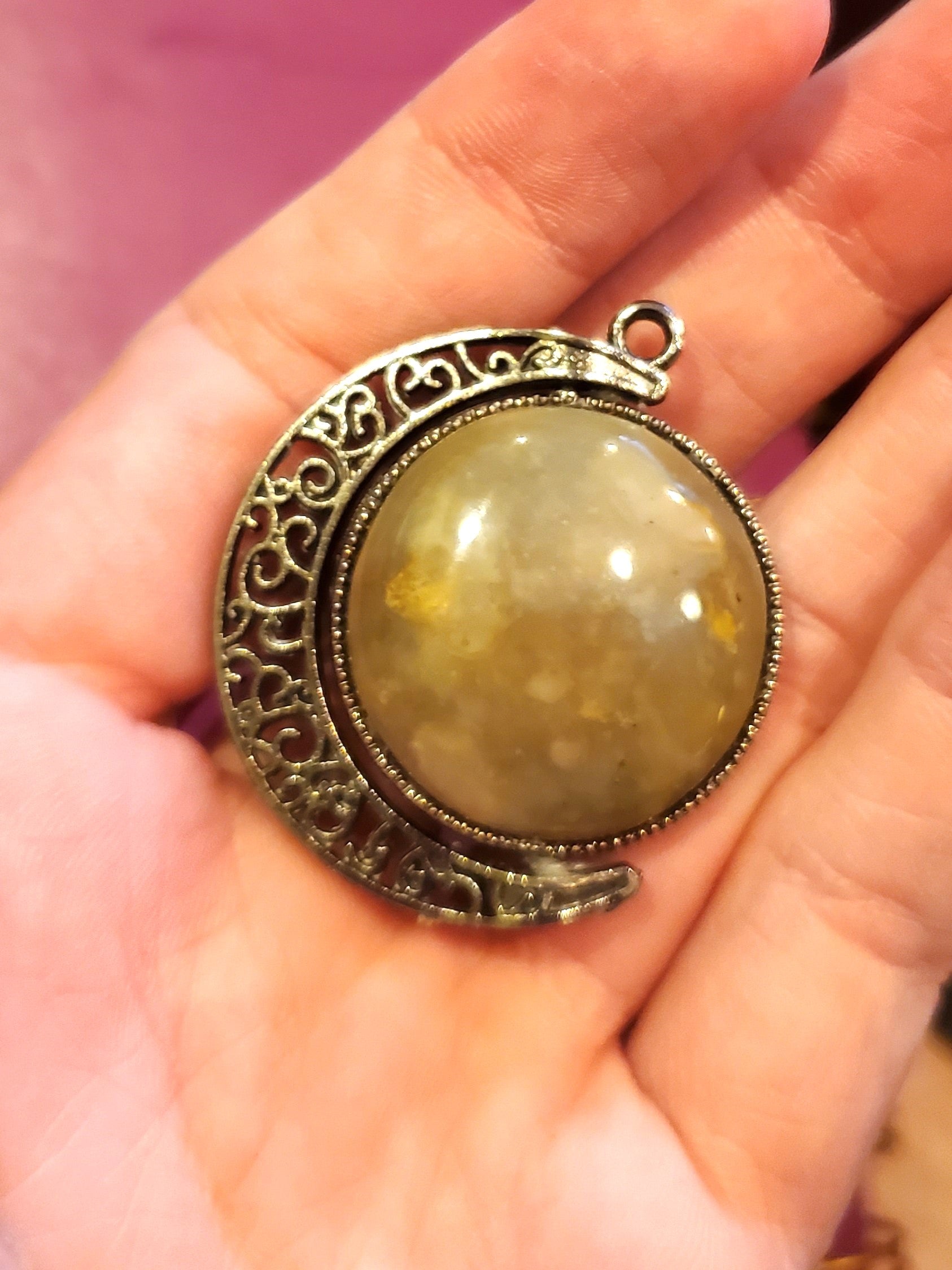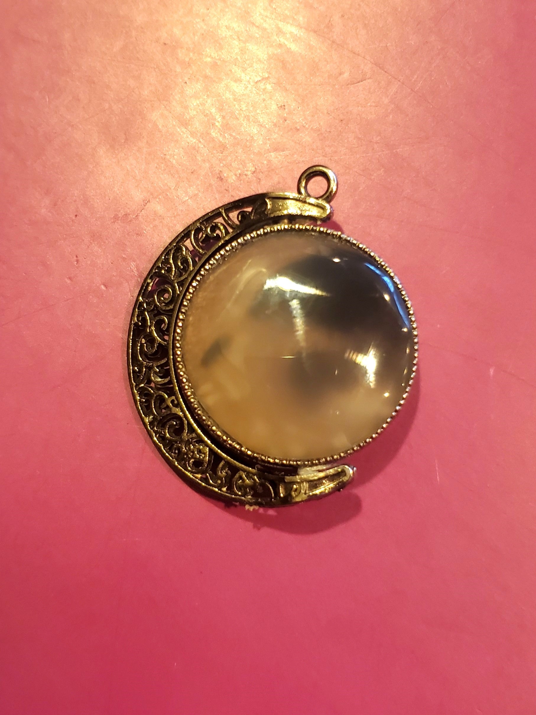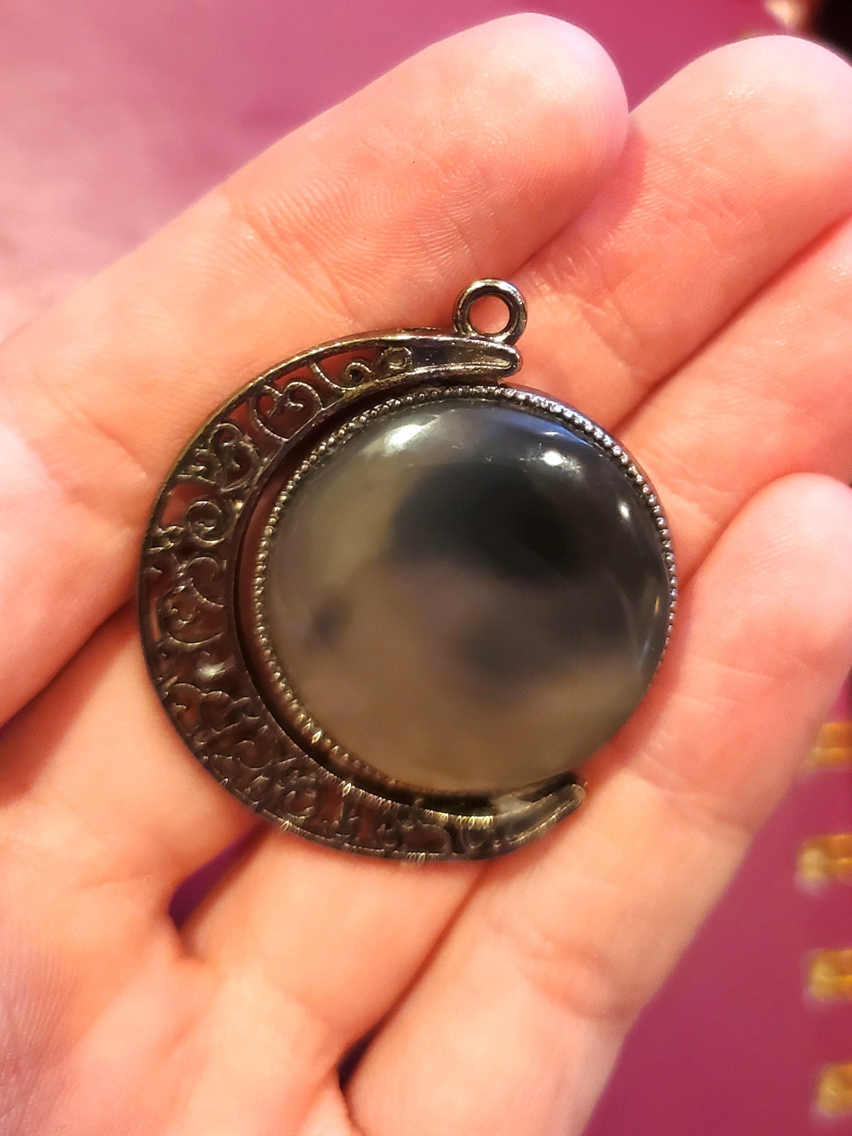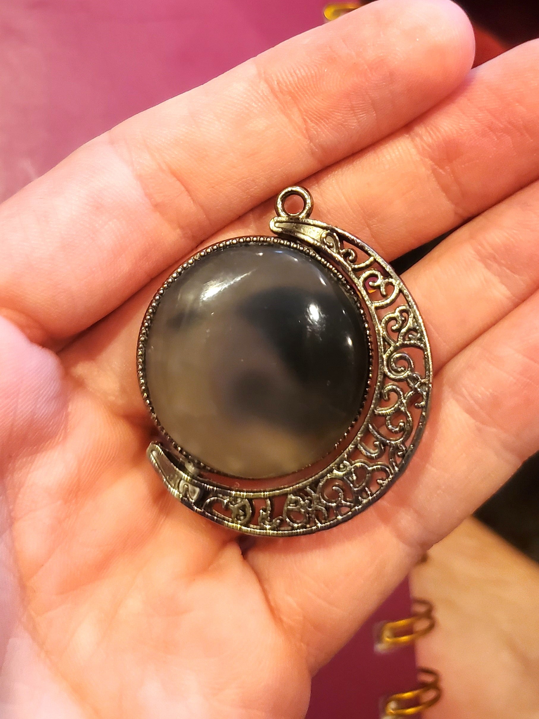 This unique piece has two different stones on a rotating setting, so the moon and stones can be worn in any orientation! I really like this piece.