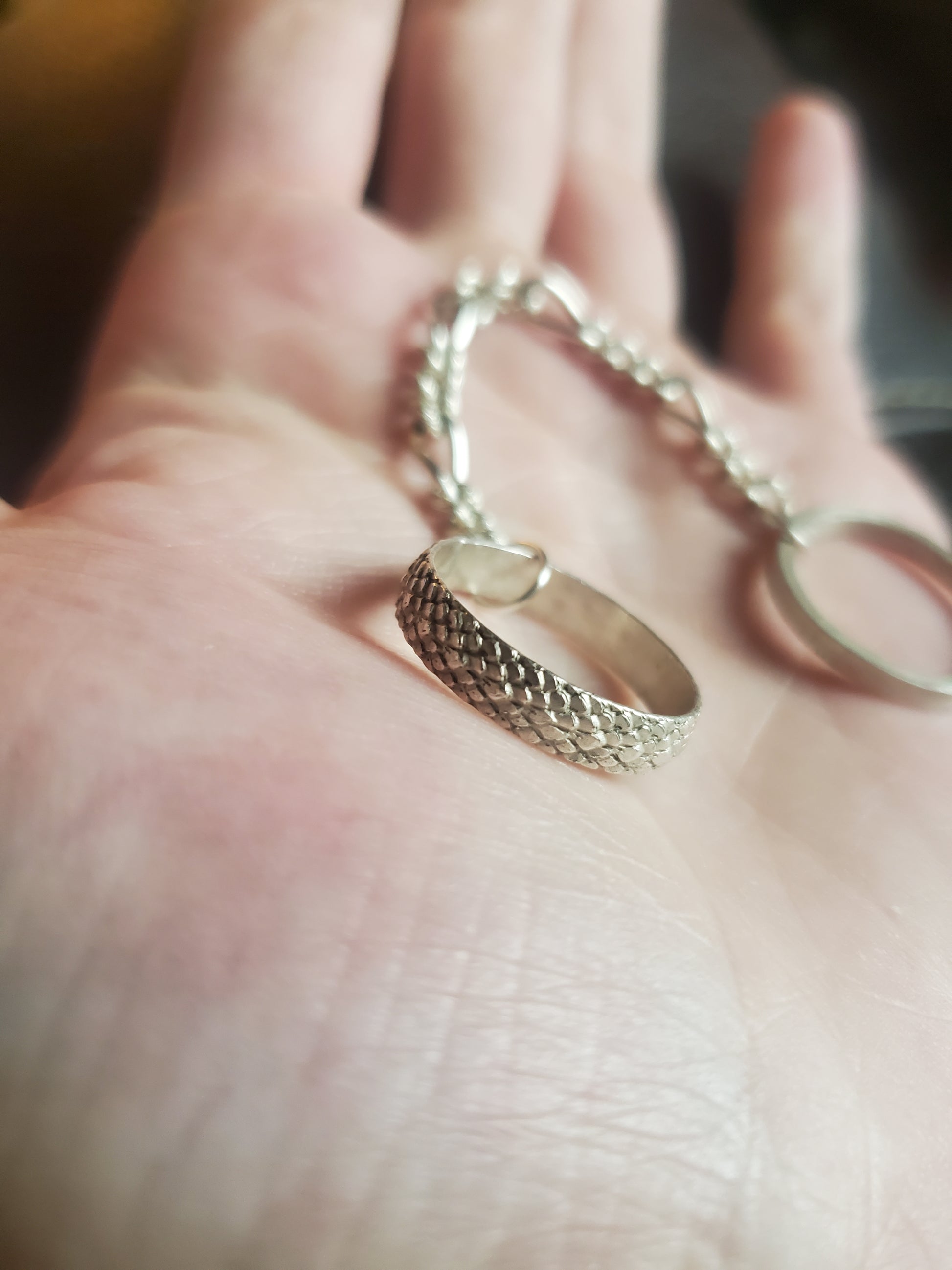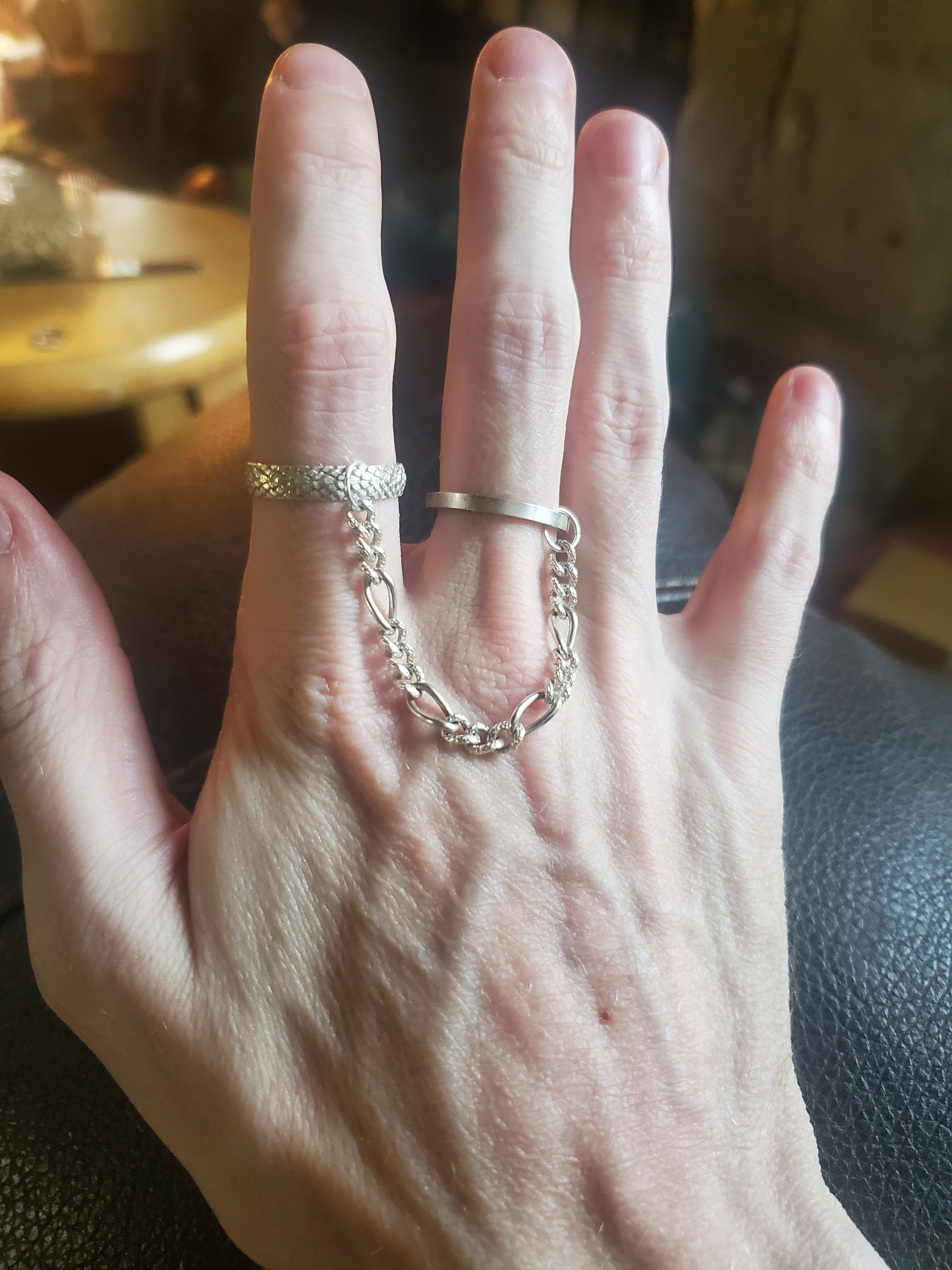 This creation of mine is a unique fashion statement which connects two rings by a stylish chain which is long enough to extend just over the knuckle or around a third finger. This allows the ring to be worn in many different ways, and to me has a very classical elegance. Because the ring can be reposition and dangled in different ways, some may find it to also find it satisfy certain fidget like tendancies. How many ways can you create to wear or twirl these ring!? Get a pair to find out.