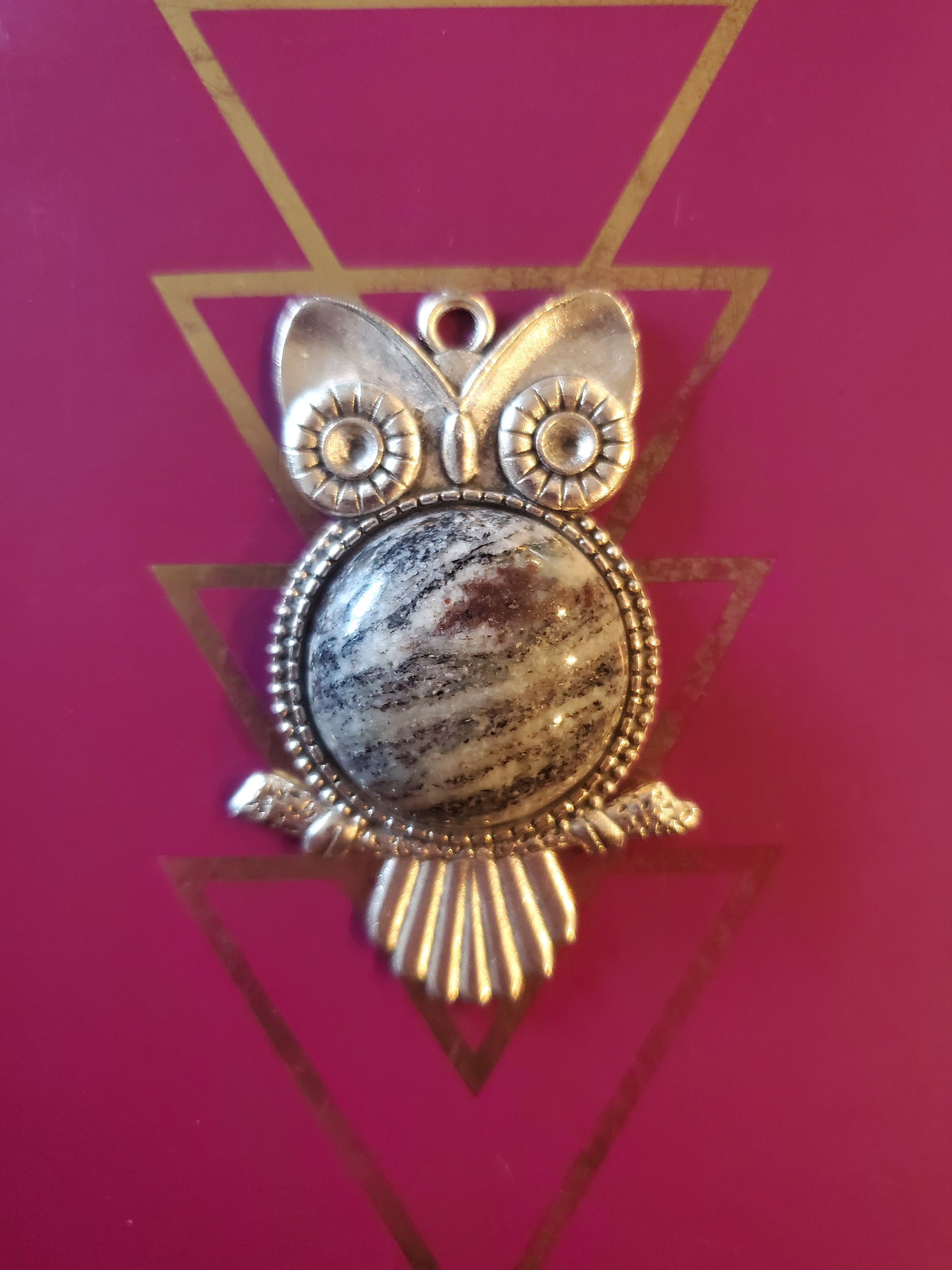 This Owl pendant feature a nice deep red garnet in schist, which is like a mixture of quartz, mica, hematite, and other minerals. I'm really happy with how this one turned out. The garnet is like its heart :) pendant is a hypoallergenic zinc alloy.