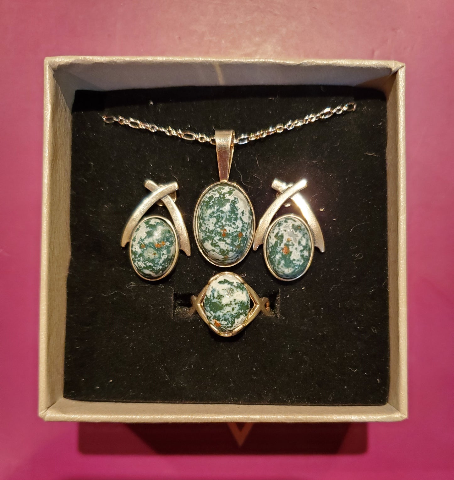 This beautiful piece of moss agate from Idaho was made into a full set of jewelry, featuring a necklace, ring, and earrings! They can be bought individually, but the set looks amazing, and I like that they all come from the same rock. This moss agate has an amazing Christmas green with some garnet inclusions, and allover looks great with anything Christmas themed, but is a nice enough set of jewelry to be worn in general in any season without necessarily evoking a Christmas feel.