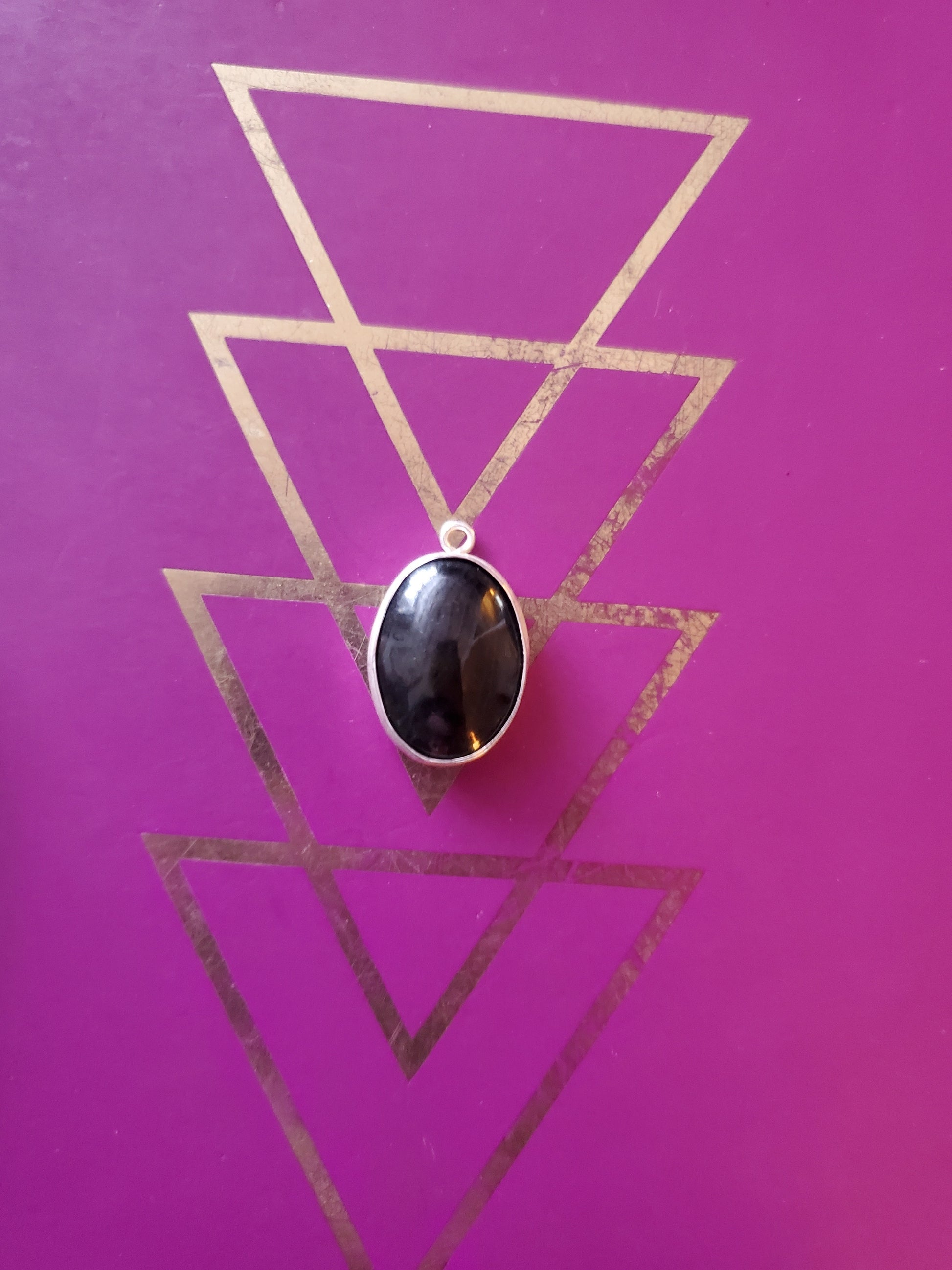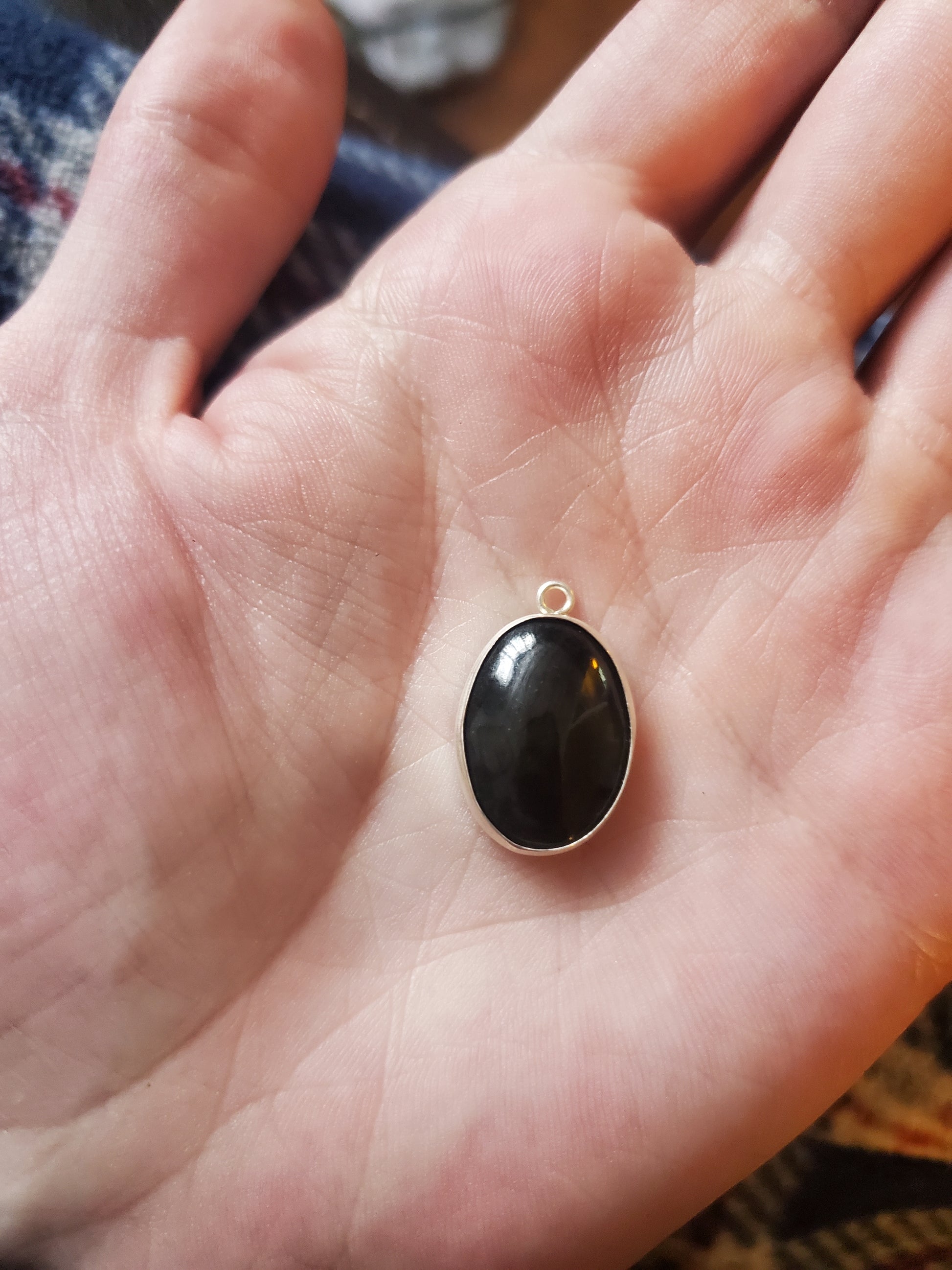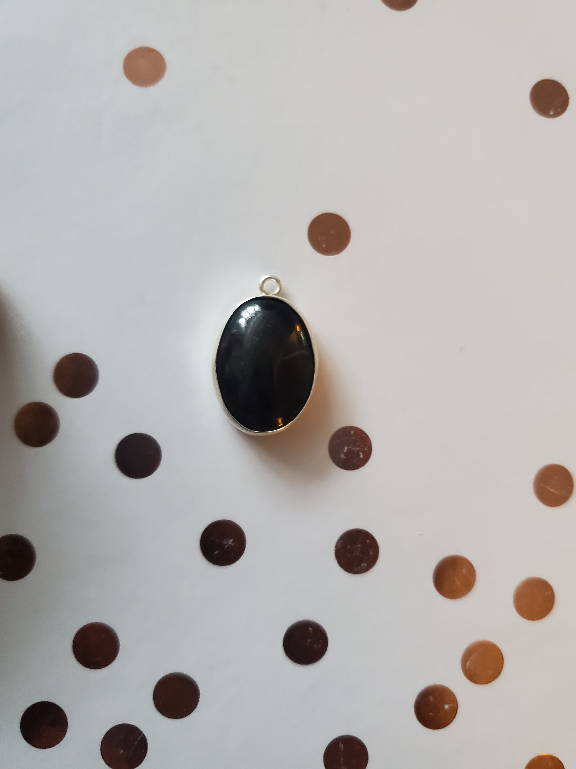 This piece feature an almost mirror like piece of Jadeite! It looks kind of like a black mirror it's so shiny, however outside or in a good light, the green of the jadeite can still be seen in the pendant.