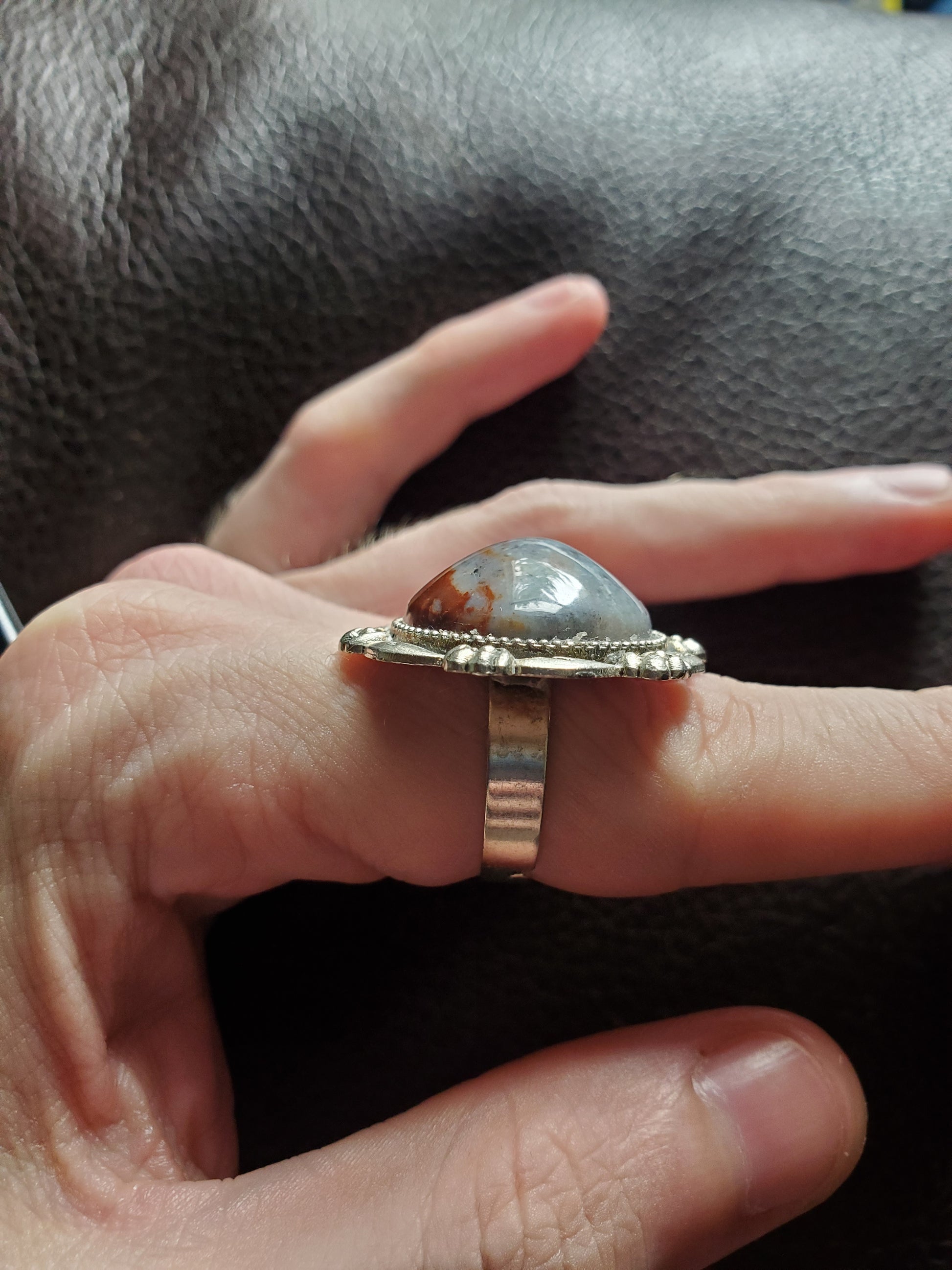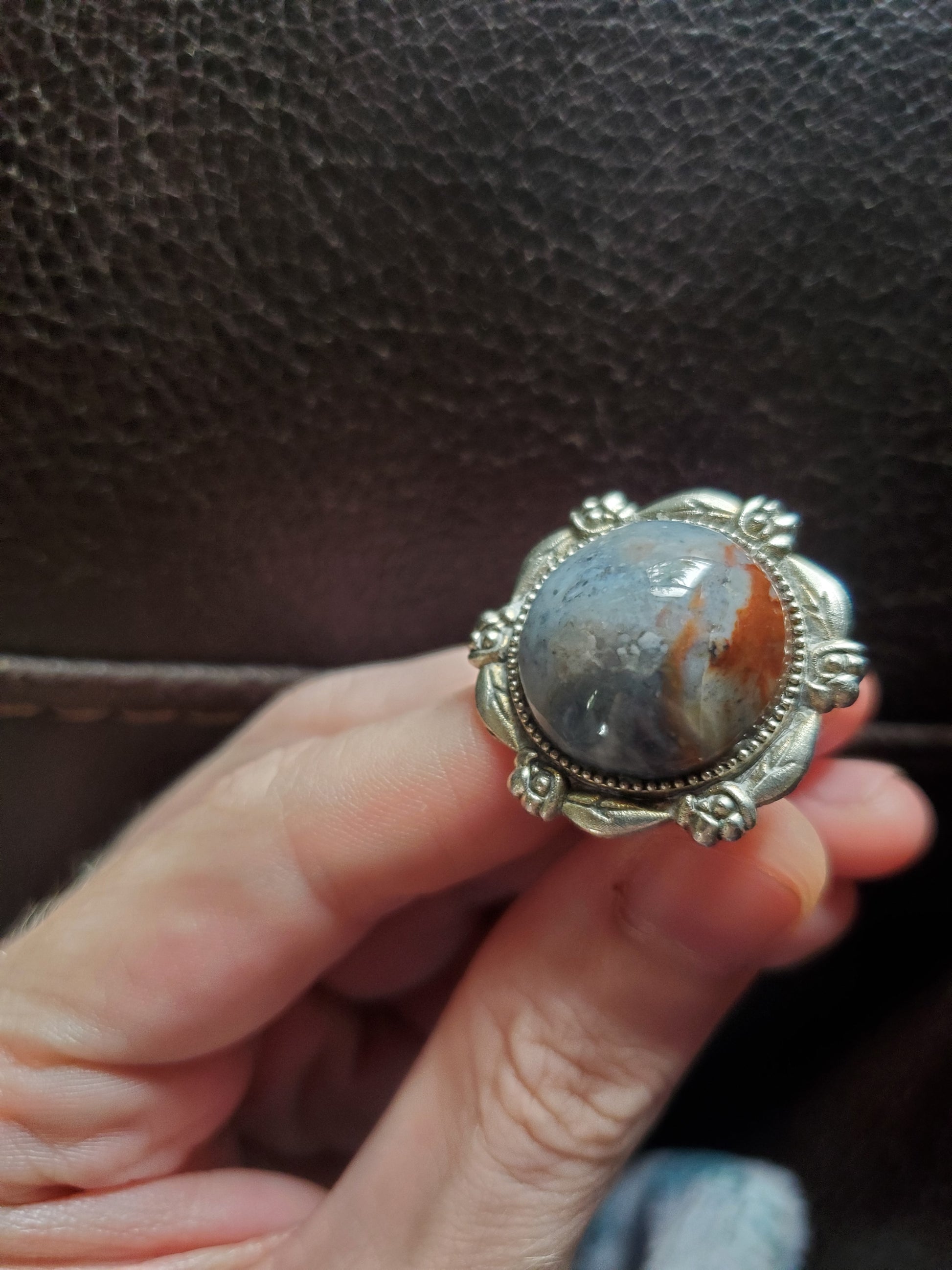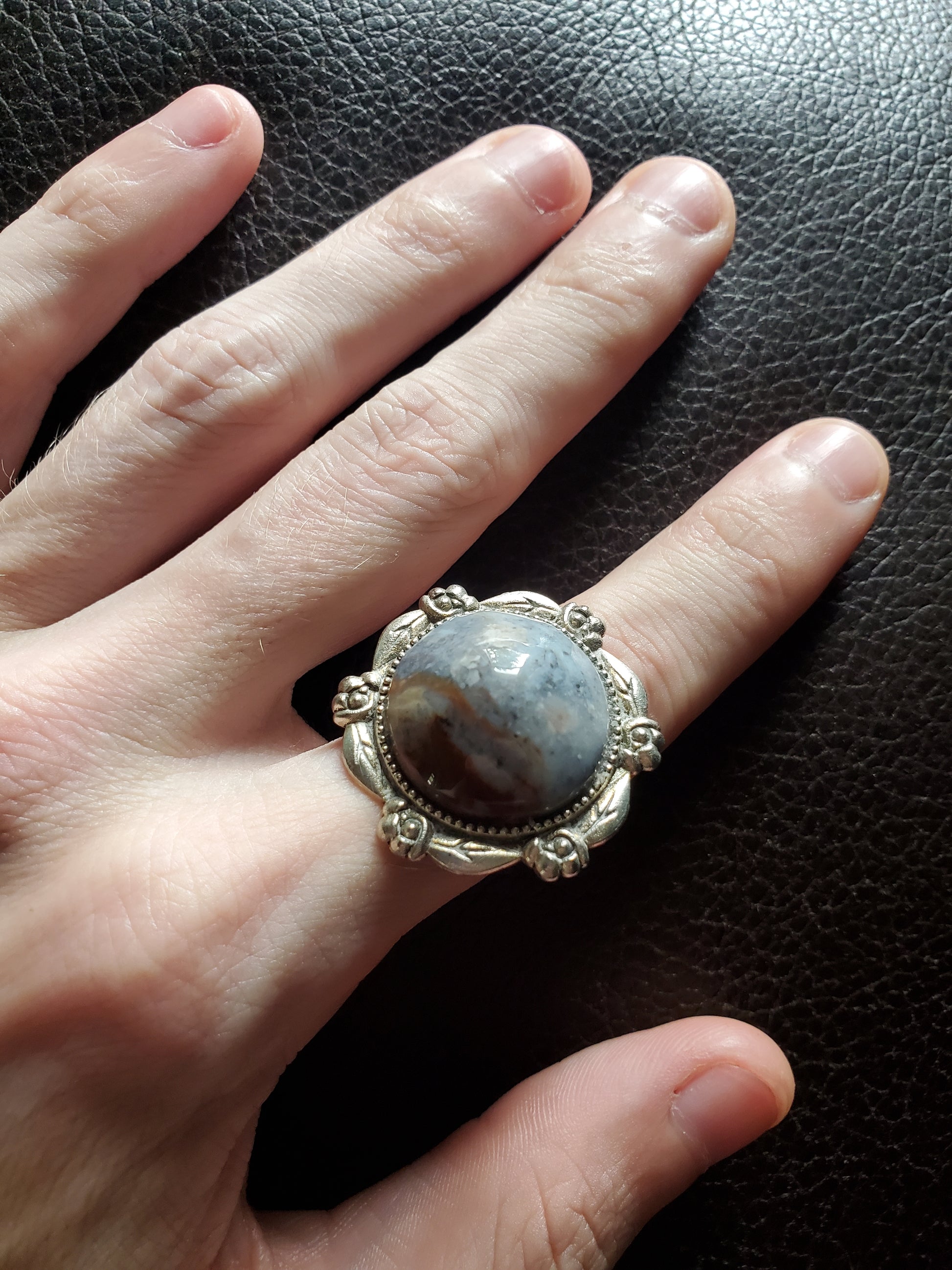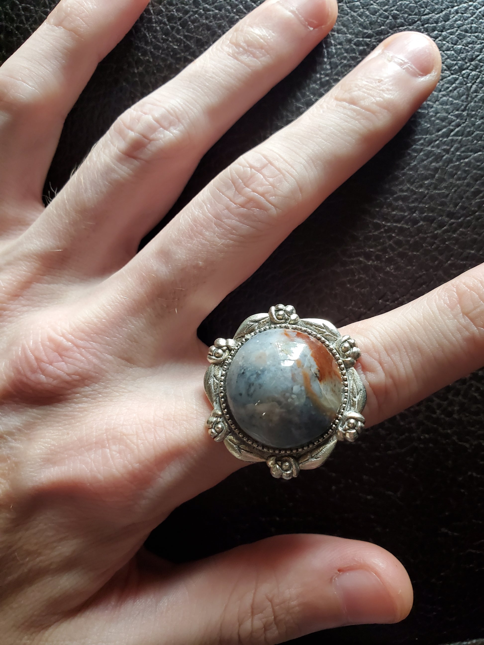This ring features a beautiful 20mm round piece of Blackfoot river jasper that reminds us of the storms and clouds of Jupiter.