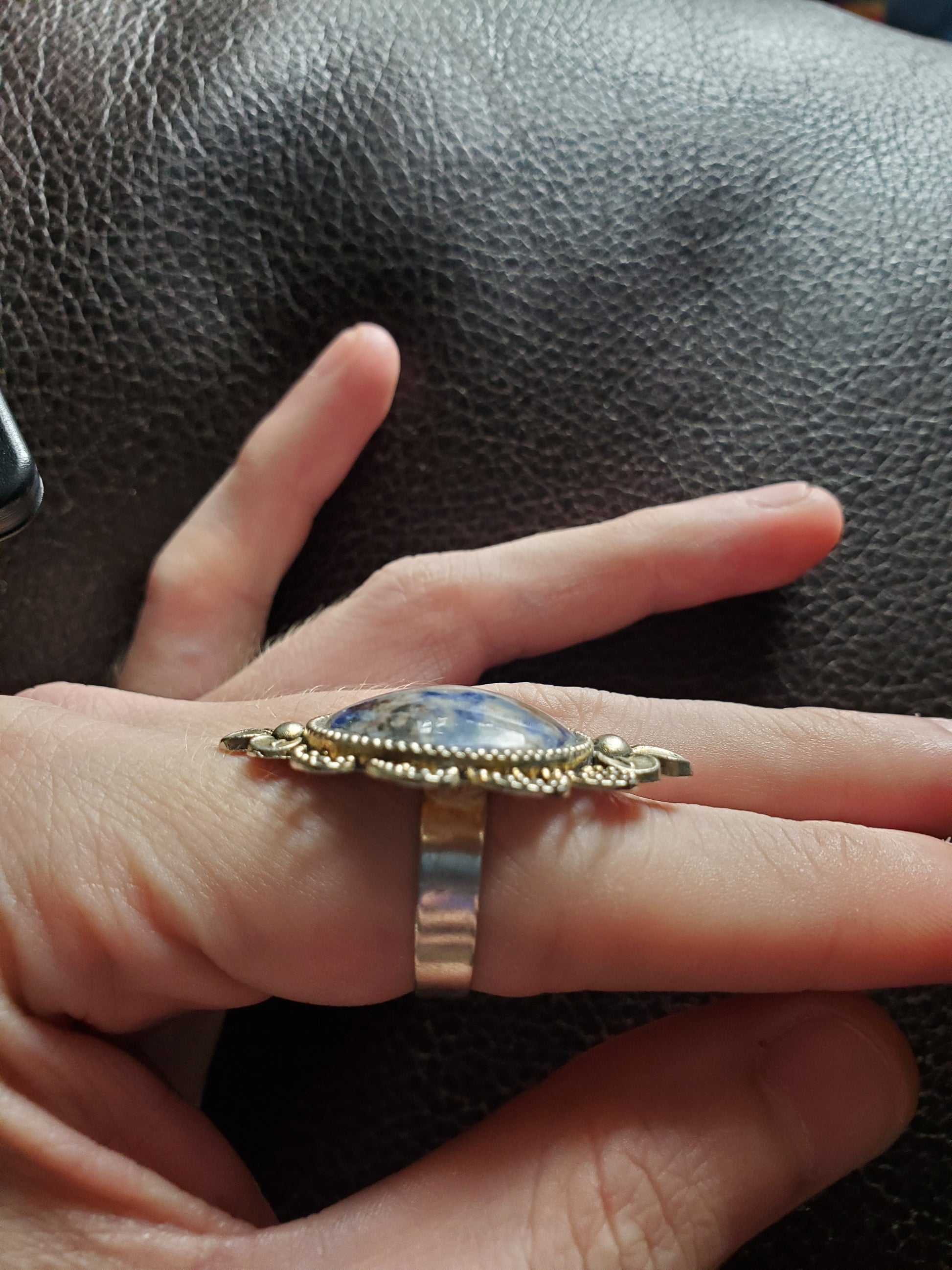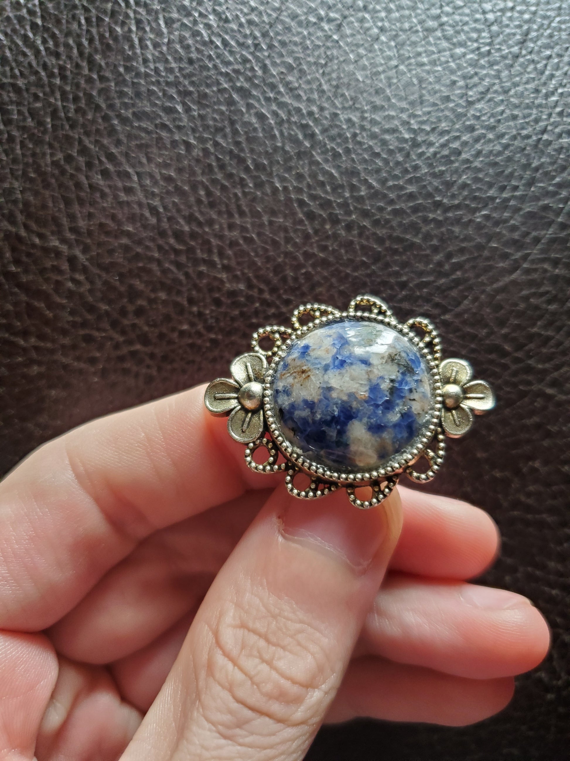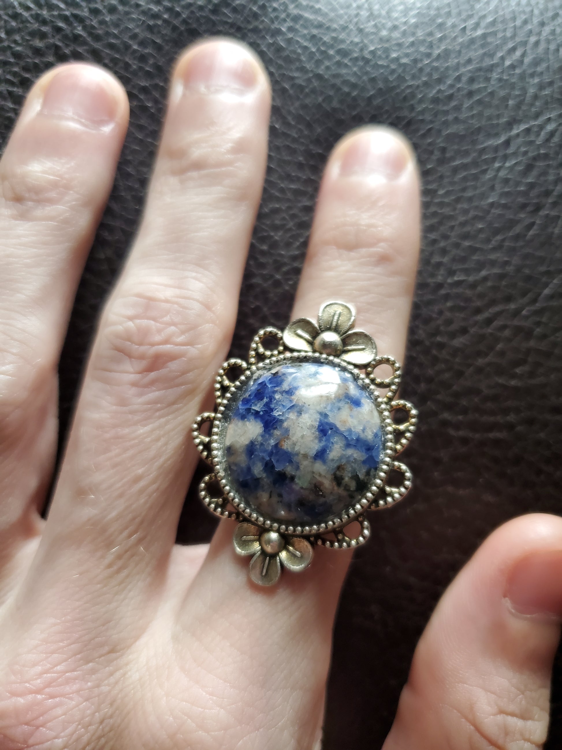 This ring features a nice 20mm round lapis lazuli on an adjustable size non-silver alloy setting. A stylish and eye catching ring!