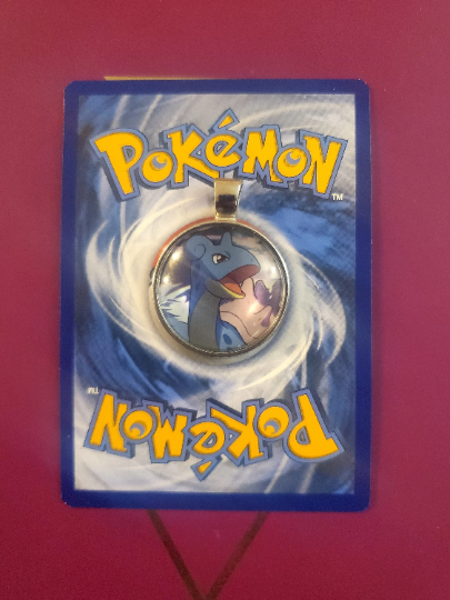 This keychain or pendant features a majestic Lapras! I really love the little extra details that some of these pendants have. Prices may vary by rarity of card used to make the pendant. If you wish to inquire about different color backing, or want more than one of a certain style, please message us and show you the style you like in the options we have.