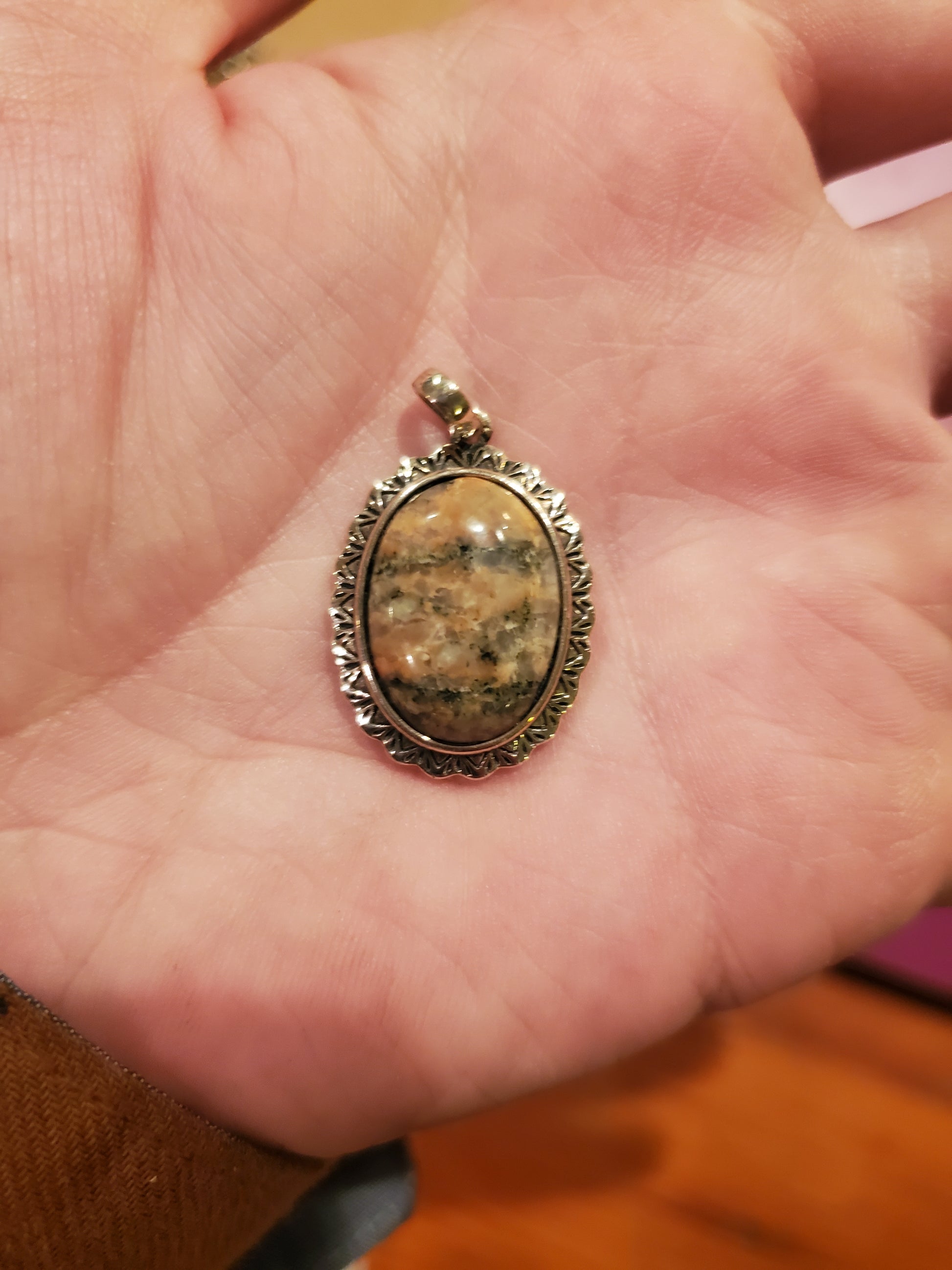 This pendant features a piece of Feldspar from the outer banks with that telltale light orange color, and some black bands from some smokey quartz still being in the rock. A great looking piece, complemented a lot by the setting it is in. It reminds me of like a New Mexico design.