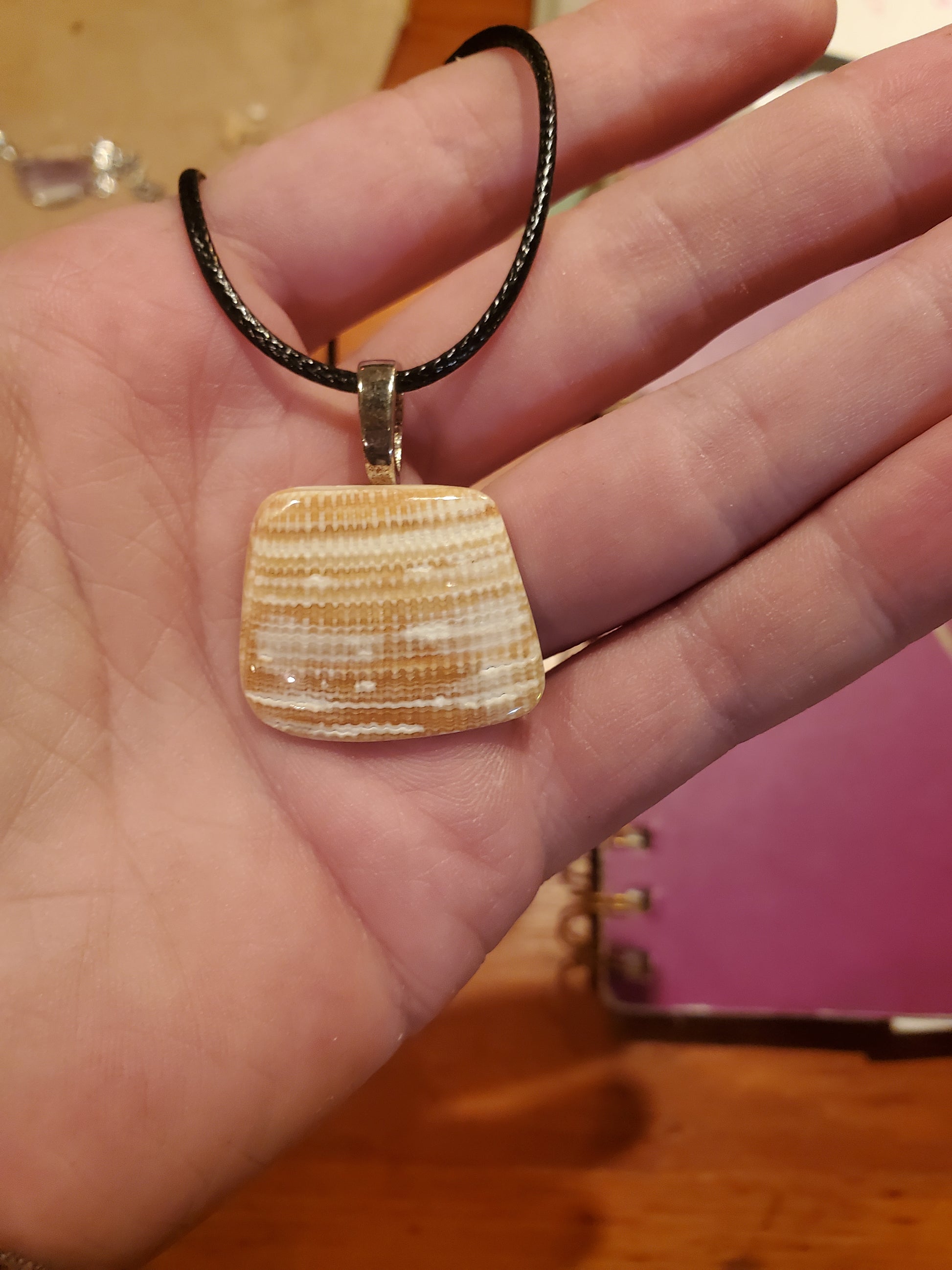 This pendant is made from a shell picked up in the outer banks that we polished and put on a simple setting. I really like the way this brings out the look of the shell!