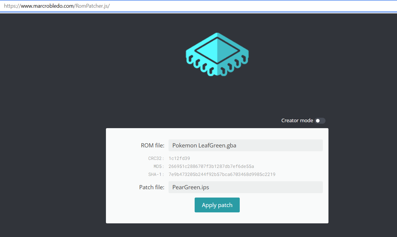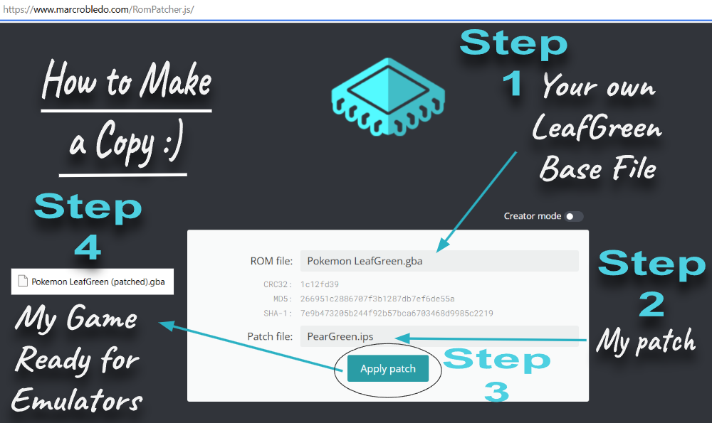 To make the game, just go to the website in the link titled 'RomPatchMaker', add the leafgreen file as the main file, and the patch as the secondary file, as indicated in the included picture. This will spit you out a patched copy of leafgreen that is now my game to play. Just rename the file if you want it to be called PearGreen, and enjoy!!