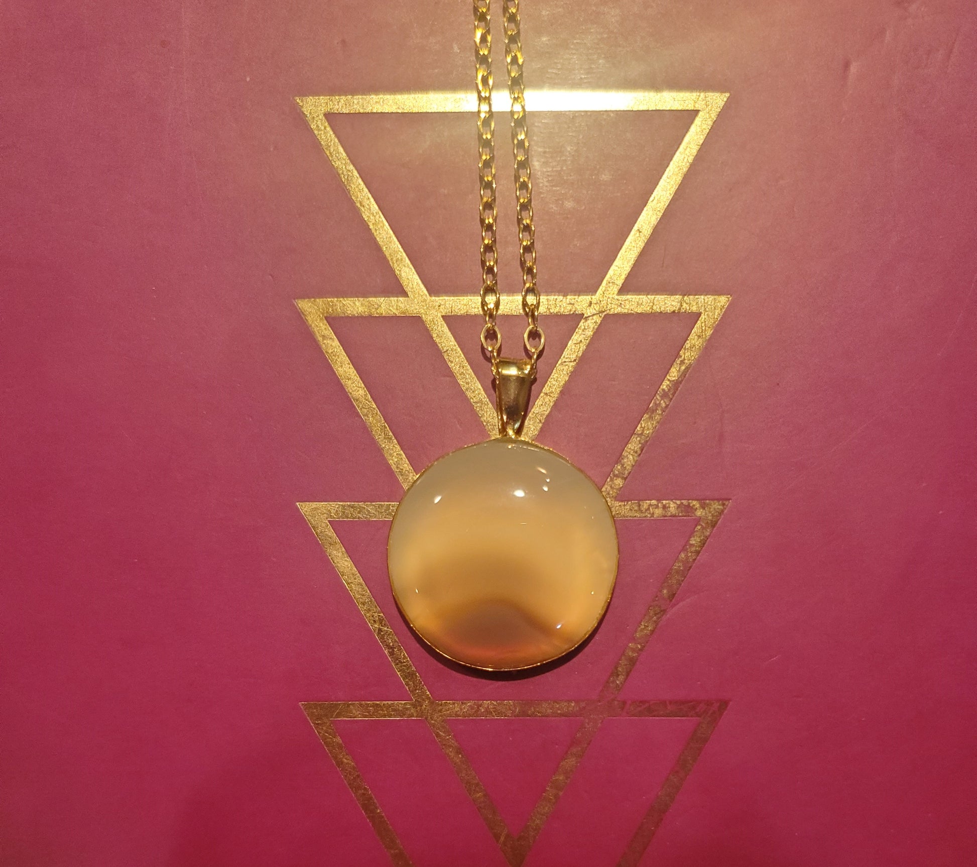 Here we have a really pretty clear agate with some banding that sort of creates a hill design in the pendant. I love the color of this one and it looks great in the gold-plated silver, with that color reflecting back through the piece.