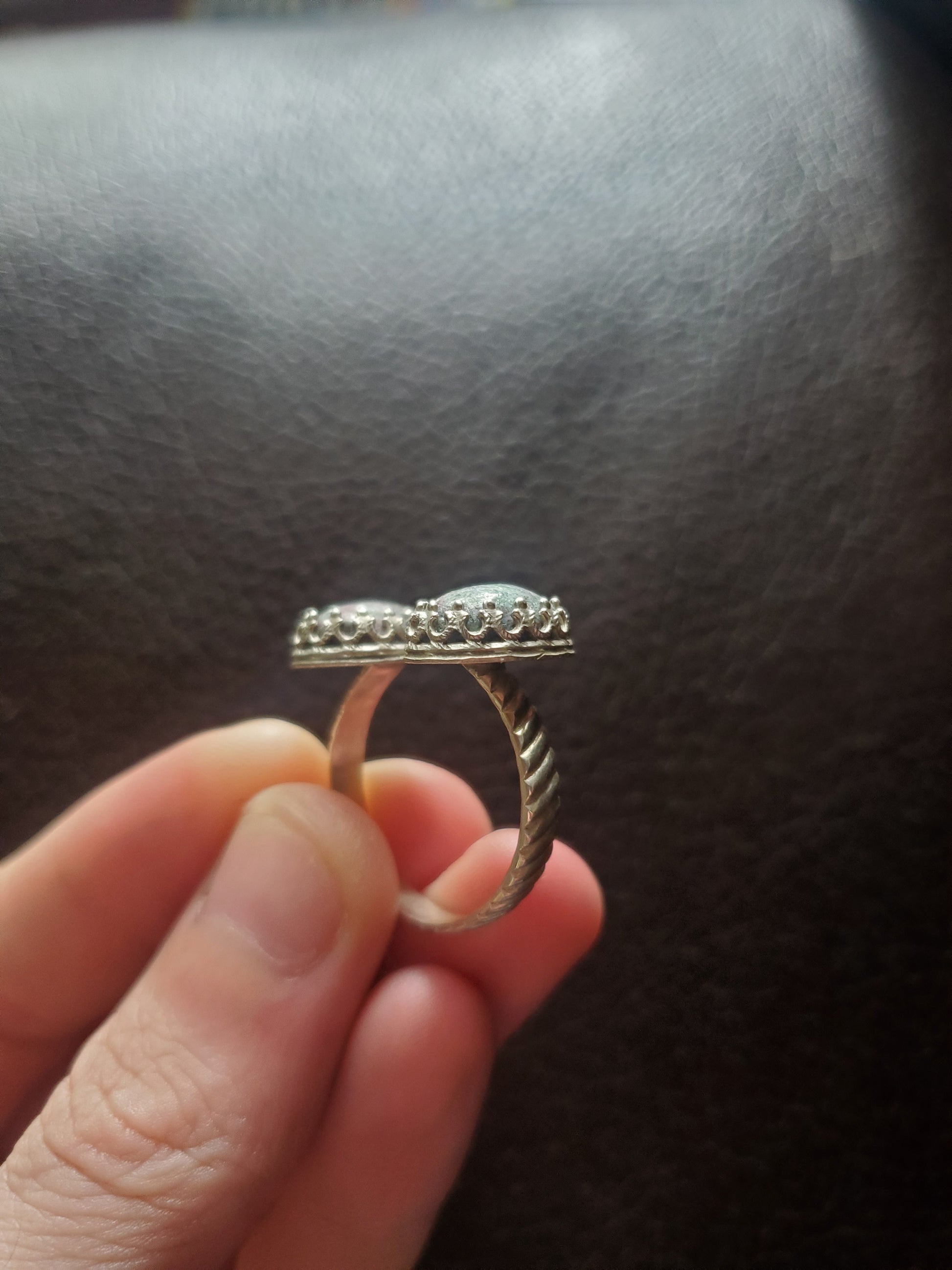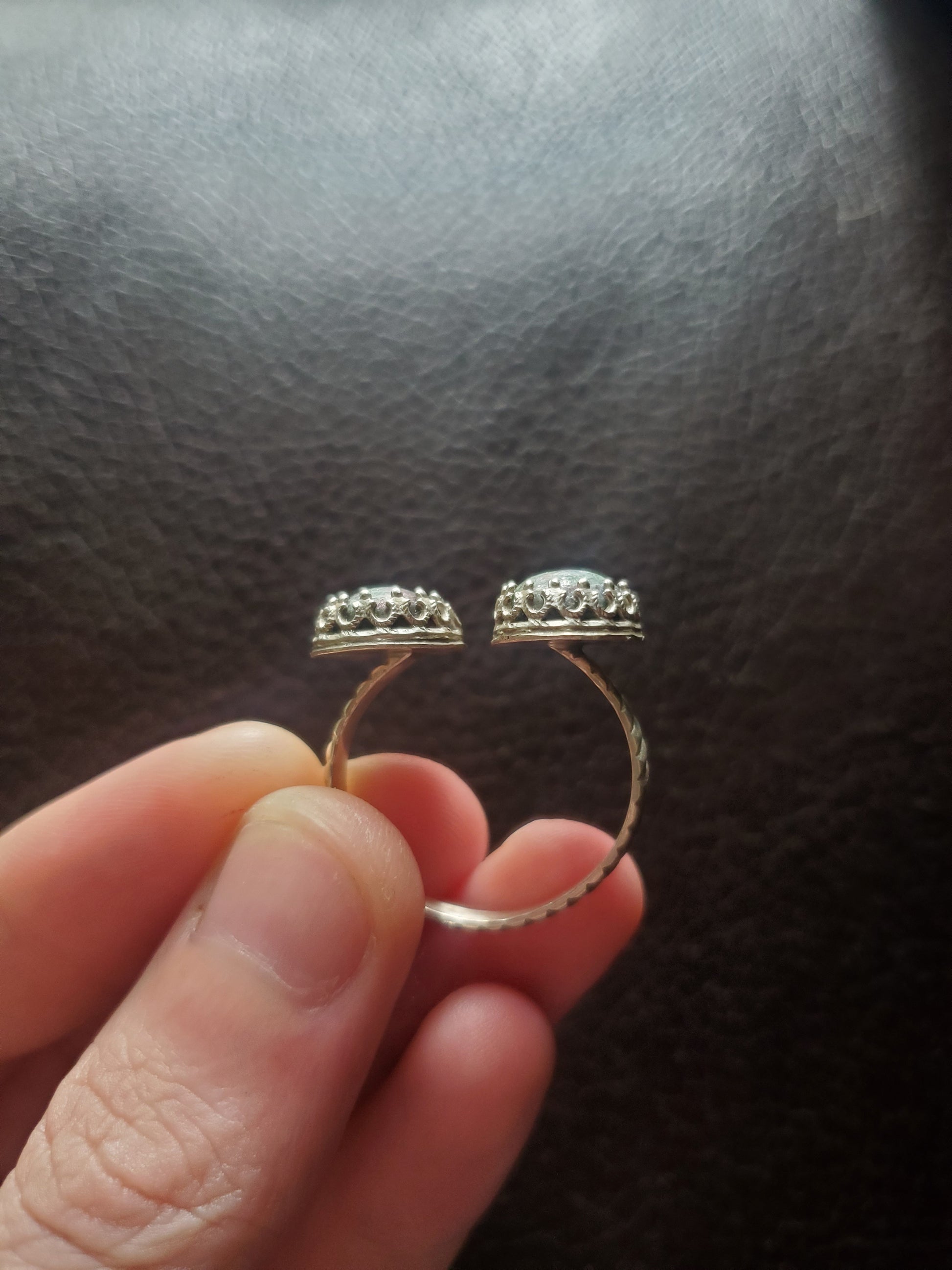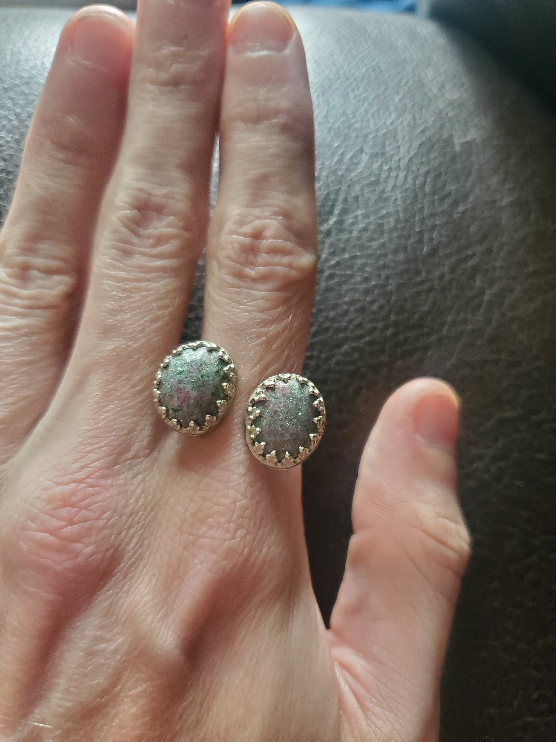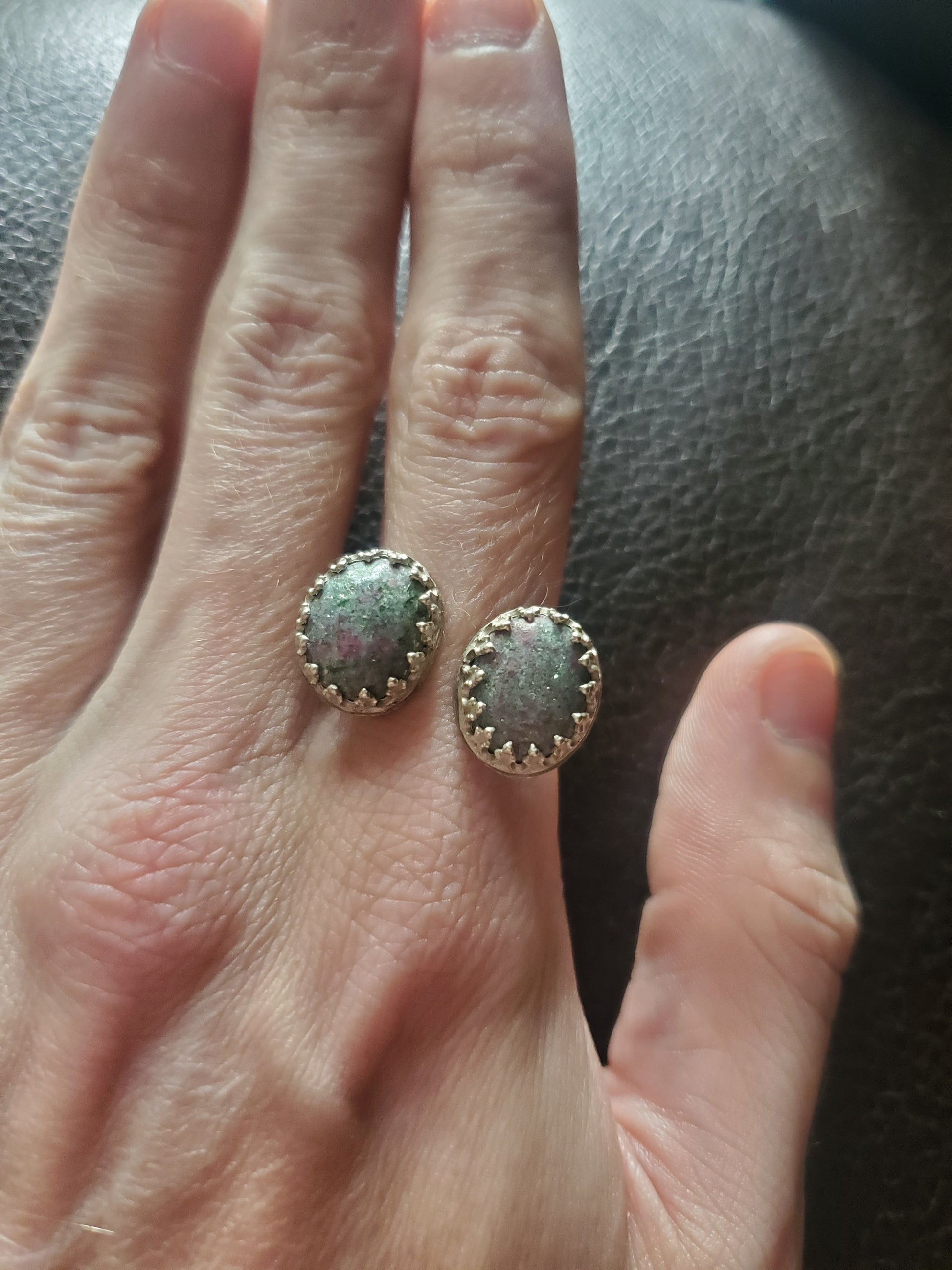 This unique ruby in kyanite ring features two cabs on an open setting, which makes it adjustable, although it's smallest size is about an 11.
