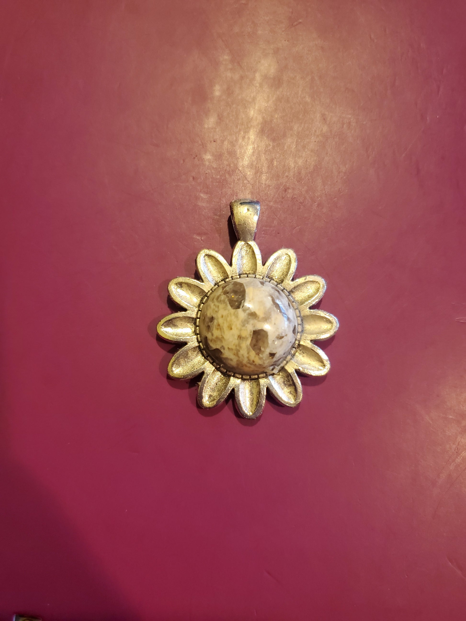 This pegmatite from Homestake Pass Montana has big chunks of Smokey Quartz in it! Really unique material. The pendant is a hypoallergenic zinc.