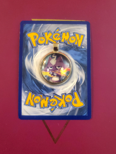 This keychain or pendant features a super cute Toxel! I really love the little extra details that some of these pendants have. Prices may vary by rarity of card used to make the pendant. If you wish to inquire about different color backing, please message us and show you the style you like in the options we have.
