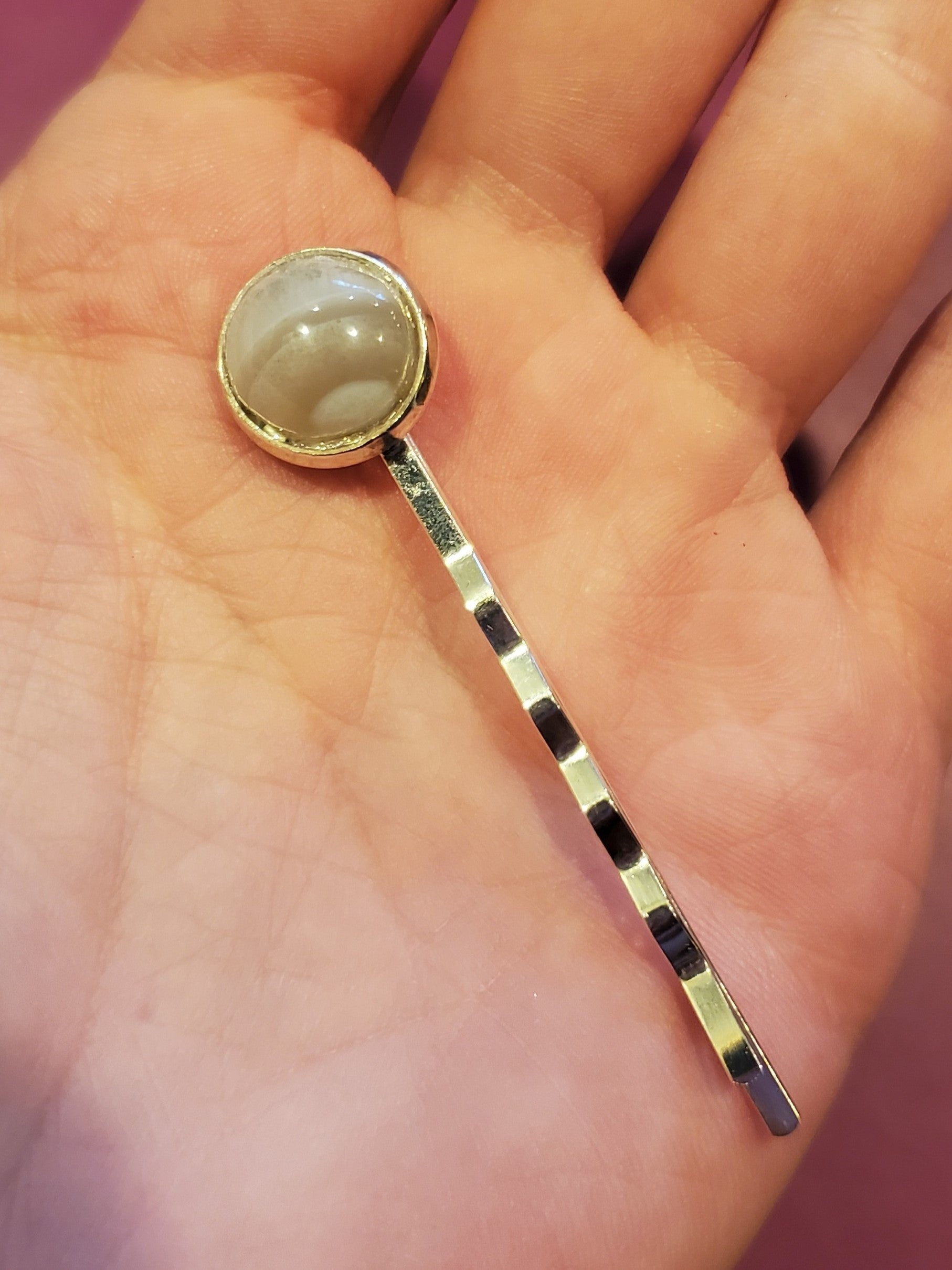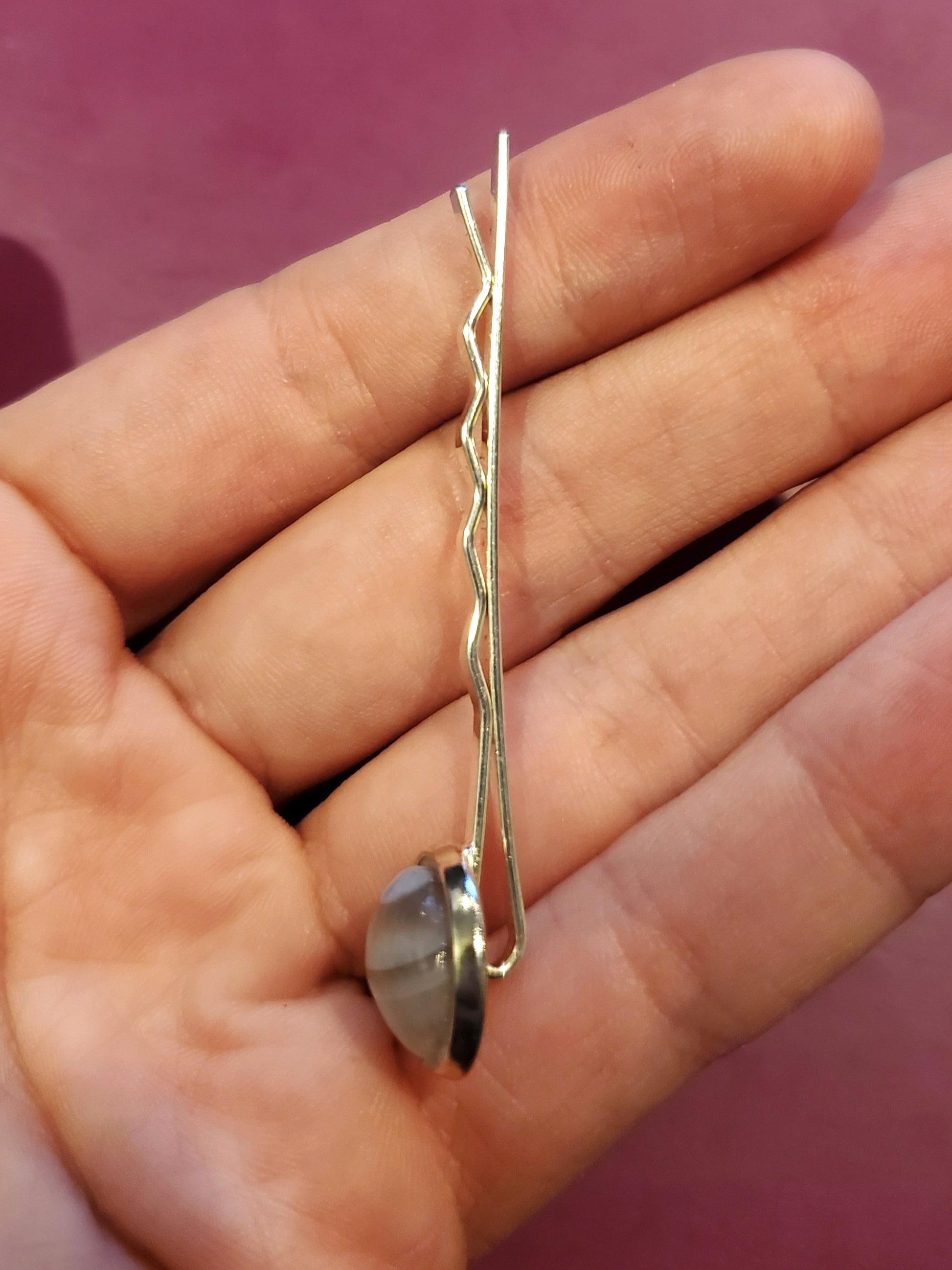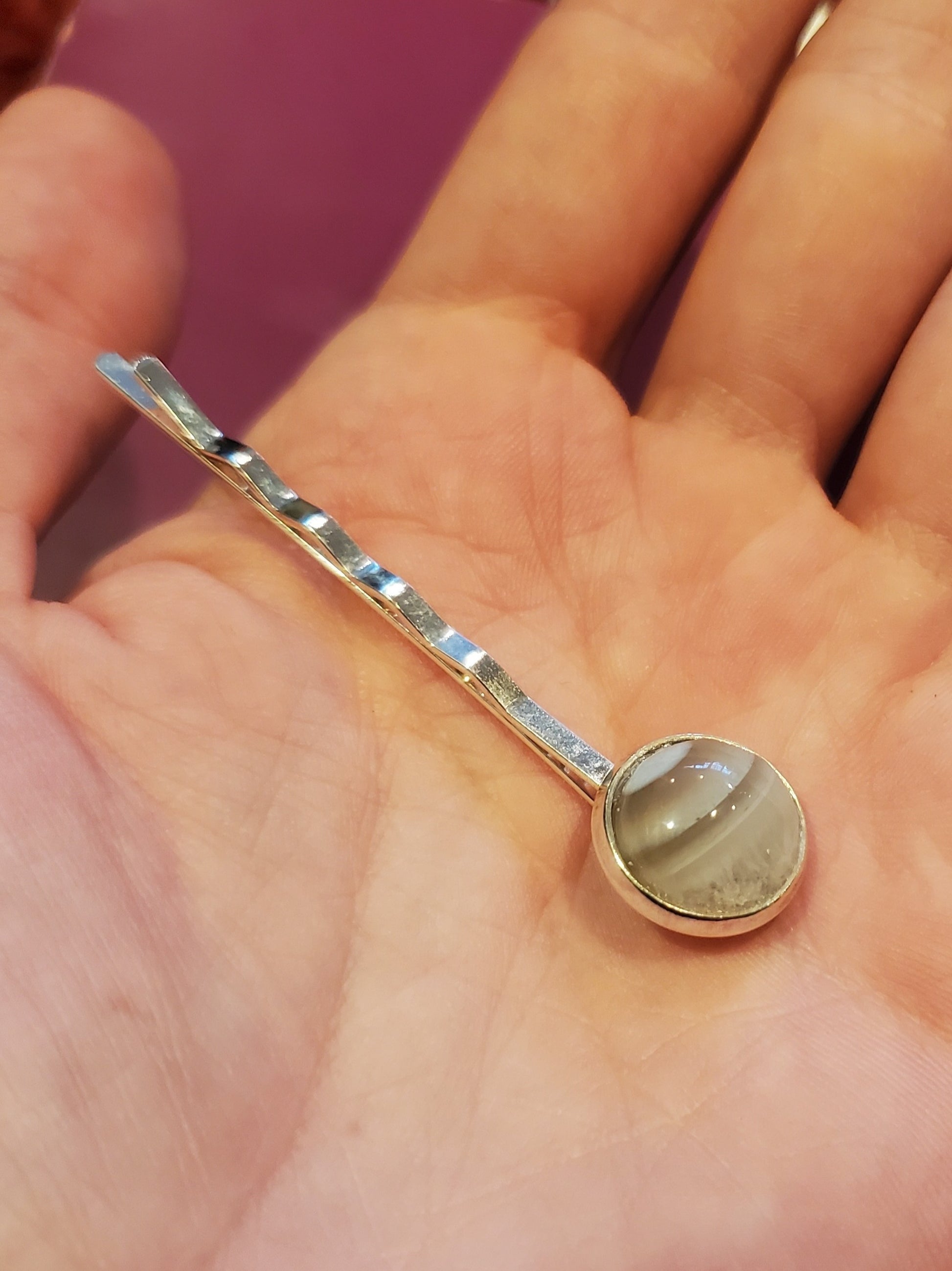 This bobby pin has a nice piece of waterline agate from Road Creek, Idaho, sporting a really nice clear to white banding that angles into the stone, making more color play. I love looking at the depth in these stones.