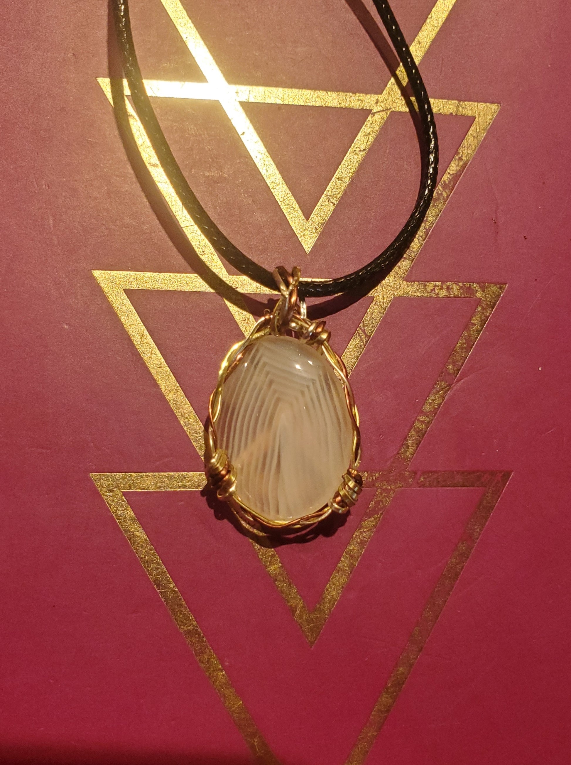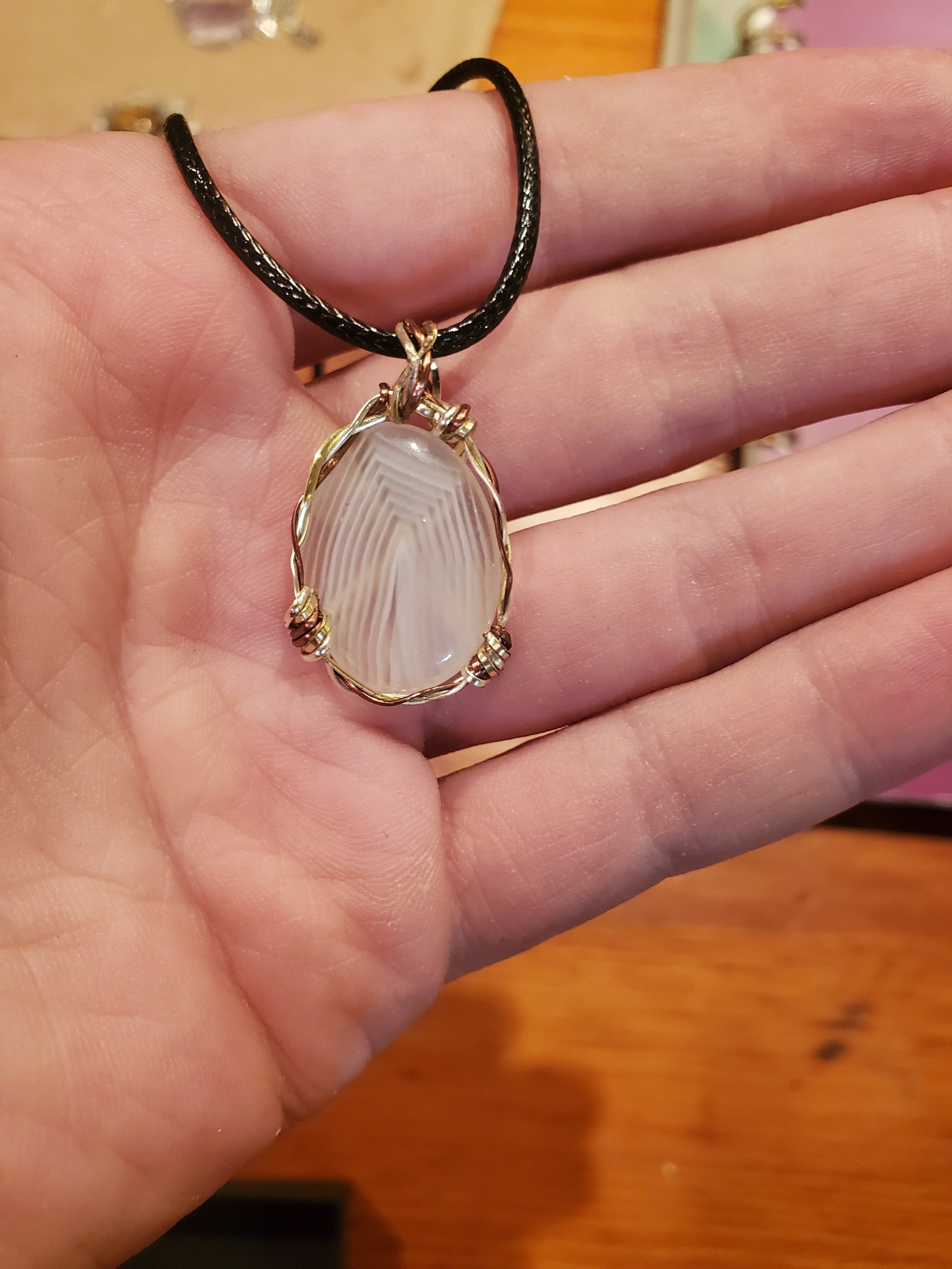 This banded agate from Idaho is given a cool windmill like pattern by the wire going across the back of the setting. I had fun experimenting with this one!